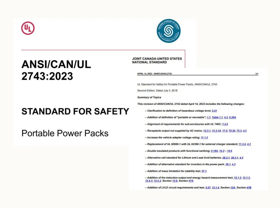 2023年4月14日,美國國家標準協會(ANSI)和加拿大標準委員會(SCC)發布了移動儲能電源的安全標準 ANSI/CAN/UL 2743:2023。此新版是舊版UL 2743:2018及UL 2743:2020的一個重要修訂,包含了一系列標準優化。