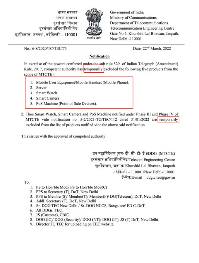 2022年3月22日,印度TEC發布通知,暫將如下五種產品排除在其認證范圍之外:1、移動用戶設備/移動電話(手機);2、服務器;3、智能手表;4、智能相機;5、POS機
